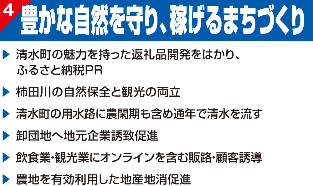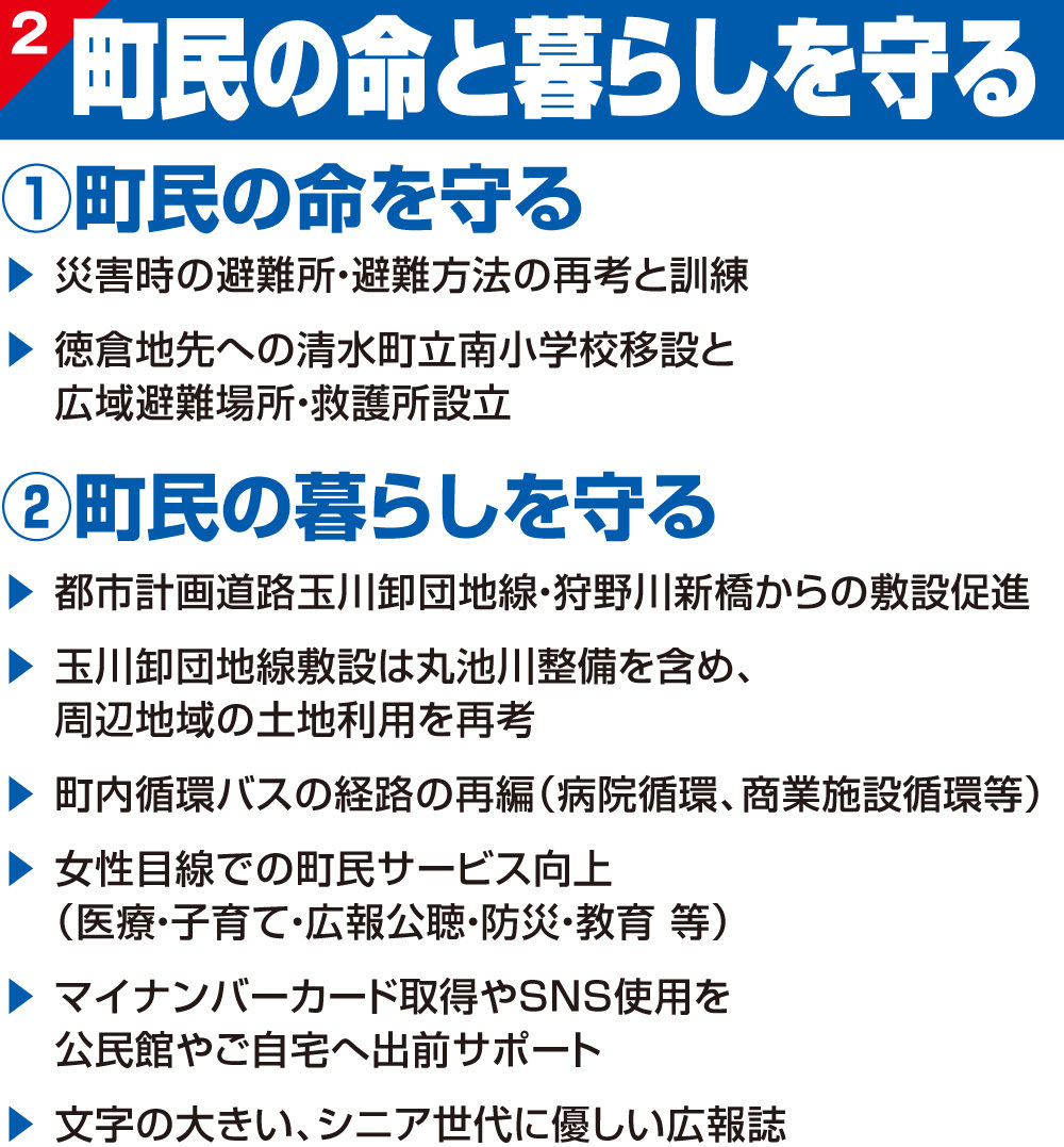 弱者に寄り添い、元気な町づくりに貢献したいと考え、町議会議員になりました。「町政の主人公は町民」を理念に町議会議員を経験した私の今の思い、清水町に対する思いをのせたメッセージです。町民一人ひとりが活躍できる元気な清水町を目指してこれからも真摯に取り組んでいきます。